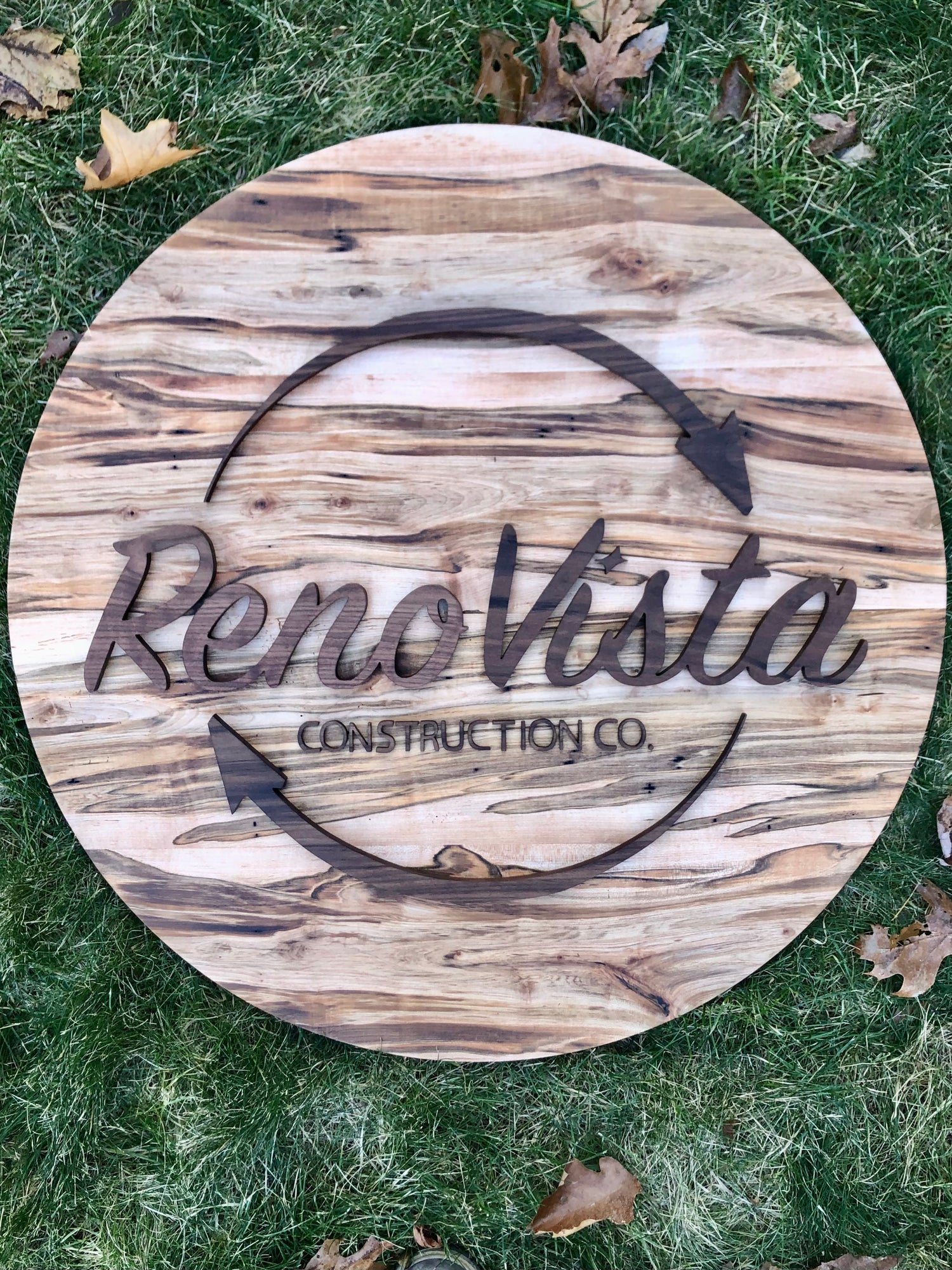 This is an example of a recent custom business logo. This is a 36” round ambrosia maple with the logo cut out of walnut.